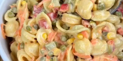 Skuvajte testeninu po izboru, dodajte grašak, kukuruz, rendanu šargarepu, seckanu papriku i seckane krastavce, a odvojeno napravite sos, pa sve dobro izmešajte.