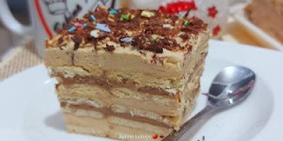 Premazite karamelom, drugi red dodati keks i čokoladnu kremu, treci karamel četvrti čokolada keks i završetak sa karamelo, odozgo može šlag.