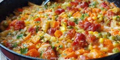 U šerpu koja može ići i u rernu sipati ulje, pa propržiti sečene kobasice. Dodati nasečen praziluk, pa kad se malo izdinsta, dodati seckano povrće koje imate.