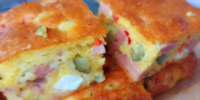 Umutiti jaja, dodati so, ulje, kiselo mleko, brašno prosejano sa praškom za pecivom. Ubaciti seckanu šunku na kockice, suvu slaninu, krastavčice i papriku na kockice i sve izjednačiti.