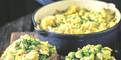 Jaja umutiti viljuškom. U većem tiganju na zagrejanom ulju kratko propržiti iseckan mladi luk, te dodati jaja i mešati minut. Potom dodati izmrvljenu fetu, so, biber, vlašac i na kockice isečen avokado, pržiti još minut-dva, pa poslužiti sa hlebom dok je toplo.