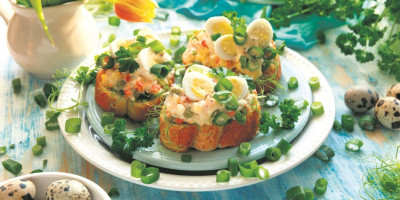 Prepeličja jaja kuvati pet minuta u ključaloj vodi, pa prohladiti i oljuštiti. Odvojeno skuvati krompir, šargarepu i grašak, pa ocediti. Krompir i šargarepu iseći na kockice, staviti u činiju, te dodati grašak, iseckanu šunku, krastavčiće i pet prepeličjih jaja. Preliti majonezom, posoliti i pobiberiti, sve dobro sjediniti, pa staviti u frižider da odstoji sat-dva. Baget iseći na kriške, preliti sa malo ulja i kratko zapeći u rerni. Odozgo rasporediti salatu i preostala prepeličja jaja isečena na kriške, ukrasiti peršunom i zelenim delom mladog luka, te poslužiti.