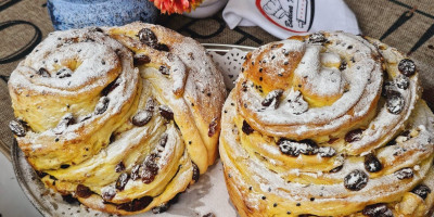 Na lako posutoj površini, razvaljati testo u veliki pravougaonik. Ravnomerno rasporediti rastopljeni ili omekšani maslac preko testa. U maloj šerpici, pomešati sušene brusnice i sušeno grožđe. Preliti toplom vodom 5 minuta, zatim procediti i osušiti.