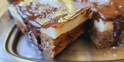 Izmešano sipati u podmazan pleh, izravnati i peći na 200 stepeni 20 -25 minuta. Skuvati puding na mleku, zasladiti po želji i u njega naseći mali komadić maslaca, pa izmešati.