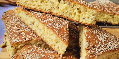 Odozgo staviti semenke, so, izmešati, dodavajući još malo mleka ili kisele vode. Testo mora da bude malo ređe. Sipati u veći pleh obložen pek papirom.