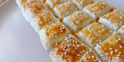 Nanesite sir na polovinu testa, preklopite drugom polovinom, odsecite ivice i secite testo na kvadrate ili pravougaonike po želji. Slažite ih na pleh.