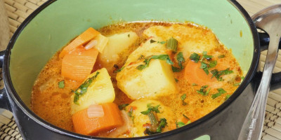 U šerpu iseckanti luk papriku i šargarepu, PA je izdinstati. Dodati crvenu papriku, suvi začin i krompir. Kuvati 20 minuta.