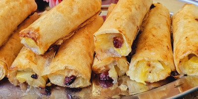 Dinju očistiti, pa je iseći na manje kriške i posuti sa grizom, Koru premazati uljem dodati drugu preko, pa i nju premazati uljem svaku stranu saviti do pola, pa sastaviti na sredini.