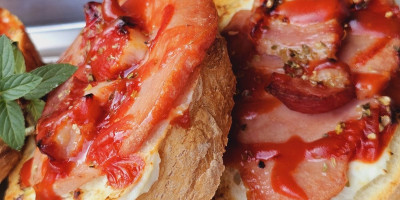 Premazati kriške hleba kiselom pavlakom, pa staviti listove šunke, kečap i listove suve slanine.