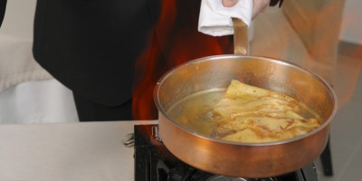 Kako biste napravili flambirane palačinke prvo pomešajte sve sastojke za testo i ostaviti da odstoji 20 minuta. Pržite palačinke na malo putera sa obe strane dok ne porumene, palačinke moraju biti tanke.