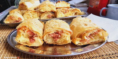 Jednu koru zgužvati, umočiti u nadev sa sirom, pa staviti na dno , pa drugu i treću natopljenu sa nadevom, Preko poređati jednu šaku rendane šunke i uviti u rolat.