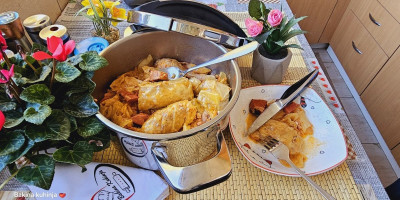 Preko uvijenu sarmu, pa kupus, pa sveže meso, sarma i kupus i opet suva rebra. Zavržiti sa sečenim kupusom i rebrima. Dodati slatku papriku i velikom kašikom masti dodati po neki lovorov list.
