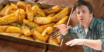Pecite pola sata u rerni zagrejanoj na 180 stepeni C, dok ne dobiju zlatkastu boju. Izvadite iz rerne a zatim uzmite rešetkicu za pasiranje krompira i lagano pritiskajte površinu pečenih krompira.