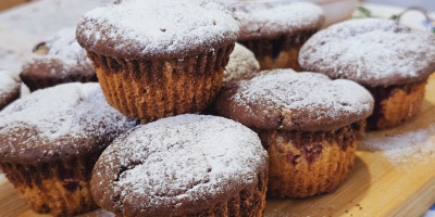 Mafine obložiti sa papirnim otvorima, pa sipati prvo svetli, pa na njega staviti po tri višnje.