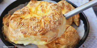 Od ovog nadeva imaćete četiri do pet velikih pitica. Premazati ostatkom nadeva ulja i posuti po želji susamom. Peć 40 minuta na 200 stepeni.