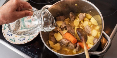 Sada pospite prethodno prosejanim brašnom, dobro ga umešajte u tečnost za kuvanje da se ne bi zgrudvalo. Kada se brašno upije dodajte belo vino i ostaviti da potpuno ispari, pa sipajte bujon. Začinite grančicama aromatičnog bilja. Poklopite i nastavite da kuvate 1 sat, povremeno mešajući.