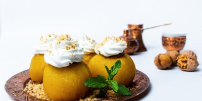 Napunjene jabuke poređajte u posudu, prelijte šećernim sirupom i stavite u frižider. Umutite slatku pavlaku, pa kada su se jabuke rashladile svaku odozgo ukrasite sa po malo šlaga pre služenja.