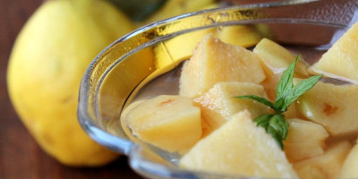 Isecite ih na manje kriške ili kockice i rasporedite u sterilisane staklene tegle. Preko dunja poslažite kolutove limuna, pa ubacite u svaku porciju po 5 kašika šećera i prelijte pripremljenom vodom sa limuntusom preko njih, do vrha tegli.