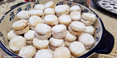 Peći oko 20 min na 180 min. Mazati džemom i spajati po dve. Uvaljati u prah šećer zamirisan vanilom.