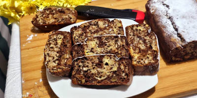 Sve izjednačiti. Podeliti na dva dela. U jedan dodati kakao, pa dodati malo vrele vode. Izjednačiti. U tamni deo dodati suvo grožđe, a u svetli seckani orah. Oba izjednačiti.