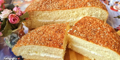Prvu loptu testa razviti oklagijom za 2 cm debljine, pa je prebaciti u tepsiju obloženu pek papirom. Premazati sa sirom. Prekriti sa drugom polovinom razvijenog testa. Ostaviti pokriveno da odmori 20 minut, pa premazati žumancetom u koji treba dodati kašičicu ulja i mleka i dobro izjednačiti.