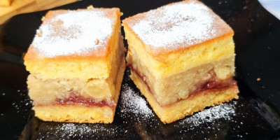 Prvu koricu polu pečenu premazati džemom i poređati jabuke i izravnati. Odozgo sipati ostatak testa, pa izravnati i peći još 40 minuta.