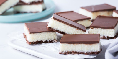 Stavite tepsiju u zamrzivač na 10 minuta. Crnu čokoladu i kokosovo ulje otopite na pari. Izvadite pleh iz zamrzivača, sipajte otopljenu čokoladu na kokosovu pločicu, koristeći lopaticu da ravnomerno rasporedite otopljenu čokoladu. Ponovo zamrznite 5-10 minuta, da se čokoladni sloj stegne.