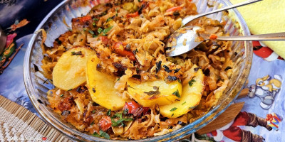 Sve lepo dinstati bez dodatka vode na tihoj vatri. Krompir skuvati. Kada nam se kupus izdinstao, treba dodati alevu papriku, crvenu mlevenu, biber, a može malo i ljuta tucana i sve izmešati.