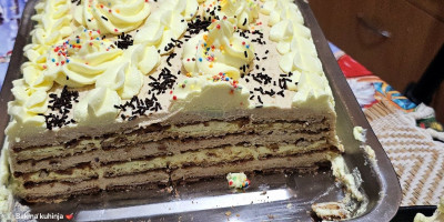 Na kraju tortu odozgo premažite šlagom. Tortu ukrasiti po želji i staviti u frižider da se stegne.