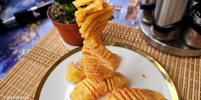 Okrenuti krompir, pa krenuti na isti način ali ukoso. Štapić premazati uljem i probosti po sredini i savijaću krompir. Ulje ugrejati i ubaciti krompir u vrelo ulje i povremeno okretati.
