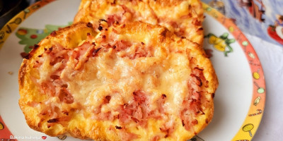 Umočiti hleb sa obe strane i ređati u pleh obložen pek papirom. Odozgo staviti rendanu šunku i rendan kačkavalj.
