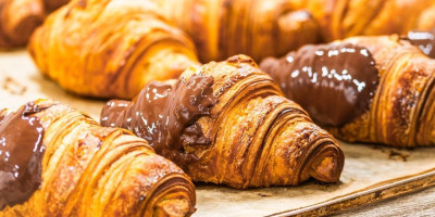 Zagrejte rernu na 180°C. U činiju sipajte brašno pa od brašna napraviti udubljenje i u njega izmrviti svež kvasac. Sipajte mleko, puter, jaje, šećer i toplu vodu. Mešajte da se kvasac rastvori. Mesite smesu rukama dok se testo ne sjedini. Mešajte dok ne postane glatko i elastično, a zatim podelite na pola. Polovinu testa pomešati sa kakaom i 15 ml mleka. Oba testa formirati u loptu i ostaviti 1 sat. I čokoladno i belo testo razvucite u pravougaonik. Položite jedan list testa na drugi i lagano pritisnite. Testo isecite na trouglove i uvaljajte u kroasane. Stavite svaku rolnu na pleh za pečenje obložen pek papirom i premažite mlekom. Pecite 20-25 minuta, ostavite da se ohladi, a zatim napunite kremom od lešnika.
