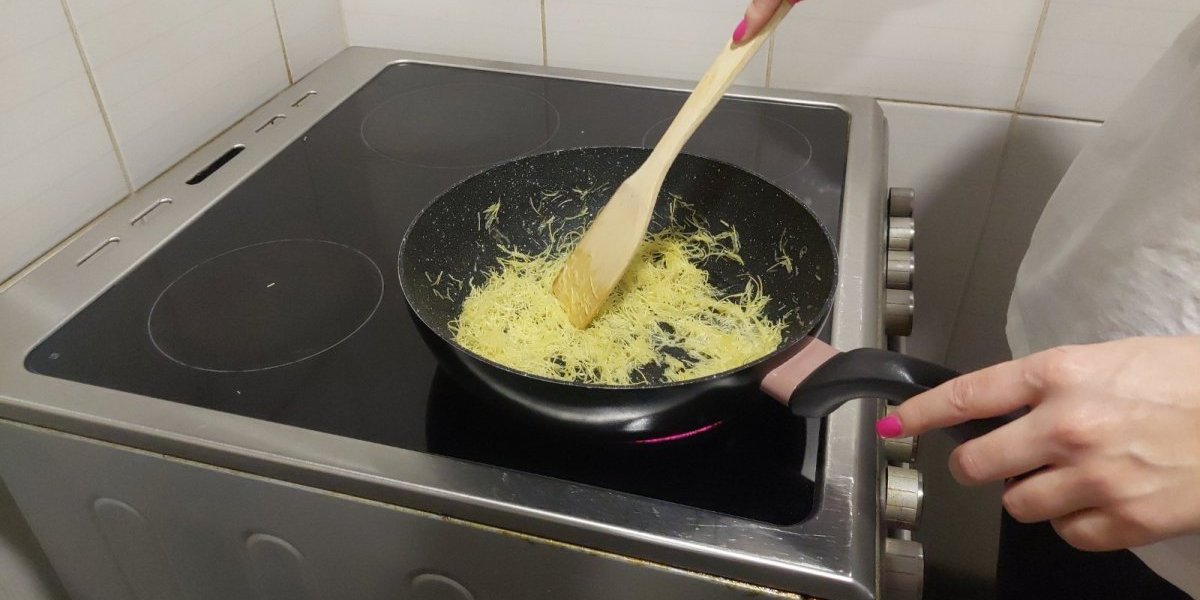 Dok se testo peče u rerni, zagrejte maslac, pa na njemu propržite kadaif, neprestano mešajući, da dobije zlatnu boju.