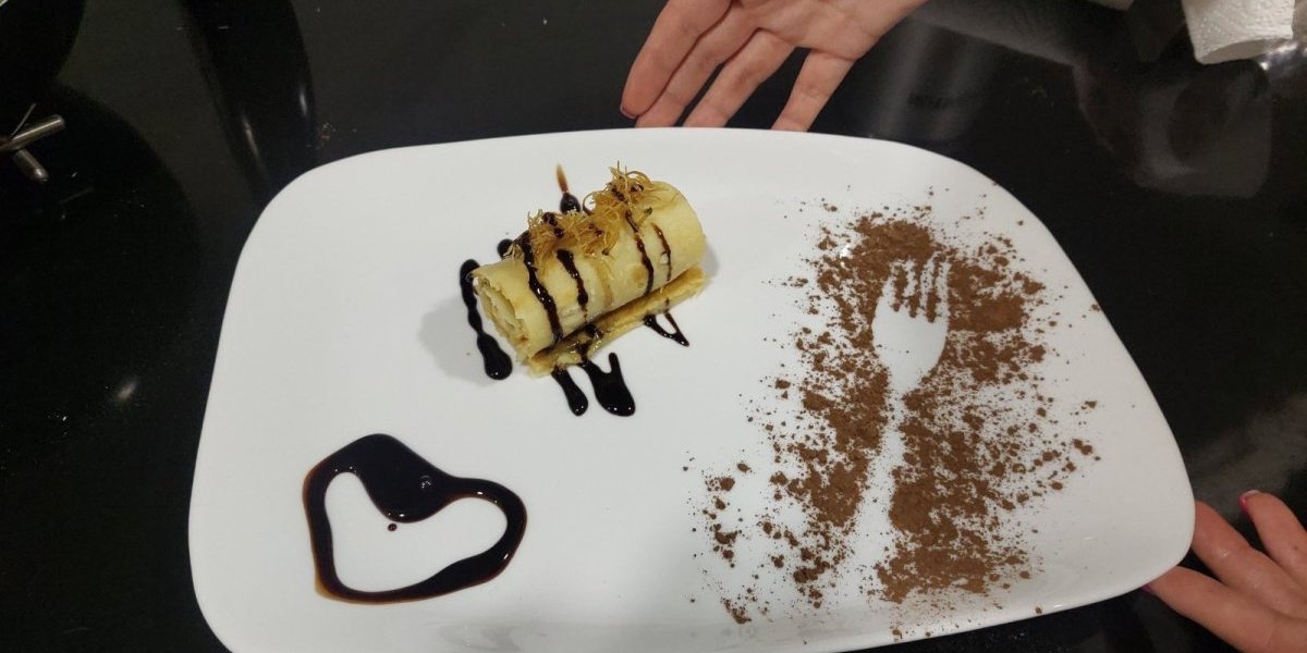 Kada se testo ispeče, ostavite da se prohladi nekoliko minuta. Koru isecite po dužini na pola, a onda na trake. Svaku traku (palačinku) premažite kremom od pistaća, prelijte tečnom čokoladom, pospite hrskavim kadaifom, uvijte u rolnice i uživajte!