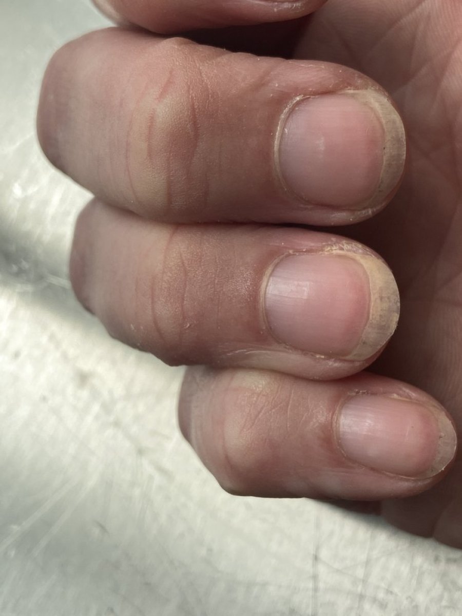 Nokti postaju debeli, rastu sporije i dobijaju žućkastu boju. Mogu izgubiti kožicu i delimično se odvojiti od nokatne ploče.