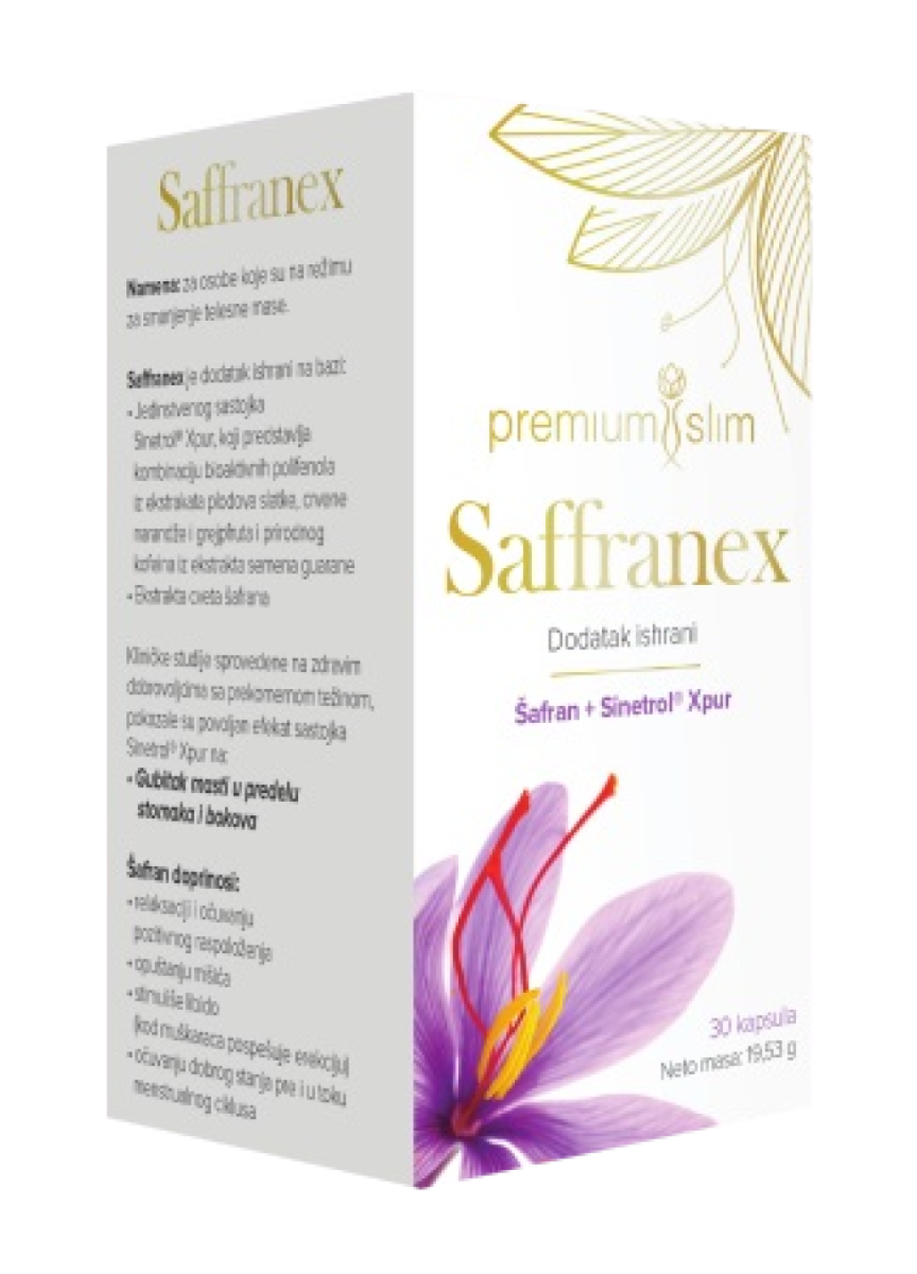 Saffranex je dodatak ishrani sa potpuno prirodnim sastavom, osmišljen da pruži podršku u procesu mršavljenja. Njegovi ključni sastojci uključuju ekstrakt cveta šafrana, patentirani kompleks Sinetrol®Xpur (kombinaciju ekstrakata grejpfruta, crvene i slatke pomorandže) i prirodni kofein iz guarane. Ovi sastojci deluju sinergijski kako bi obezbedili smanjenje apetita, sagorevanje masnih naslaga i povećanje energije.