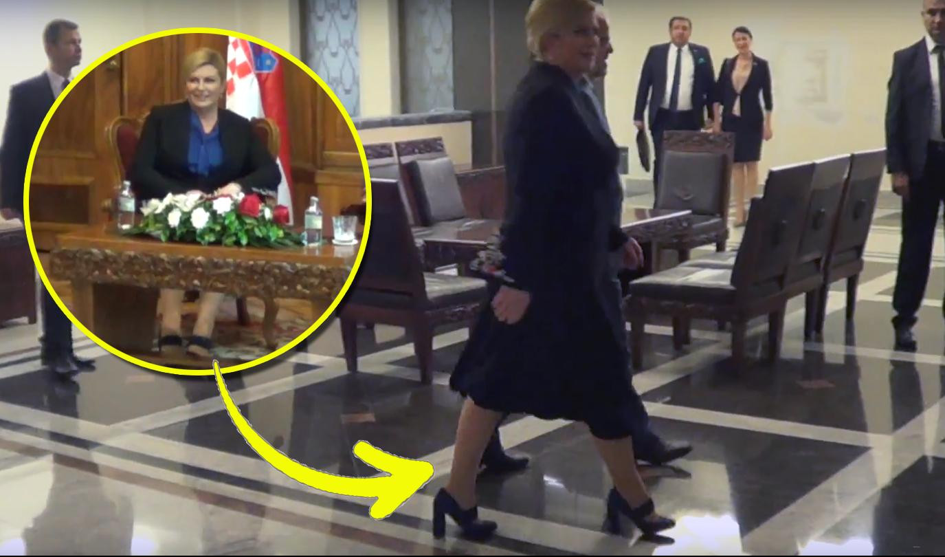 Kolinda se sa makedonskim predsednikom Đorđem Ivanovom susrela u plavim satenskim cipelama s petom koje je uskladila s plavom košuljom koja joj se nazirala ispod crnog sakoa.