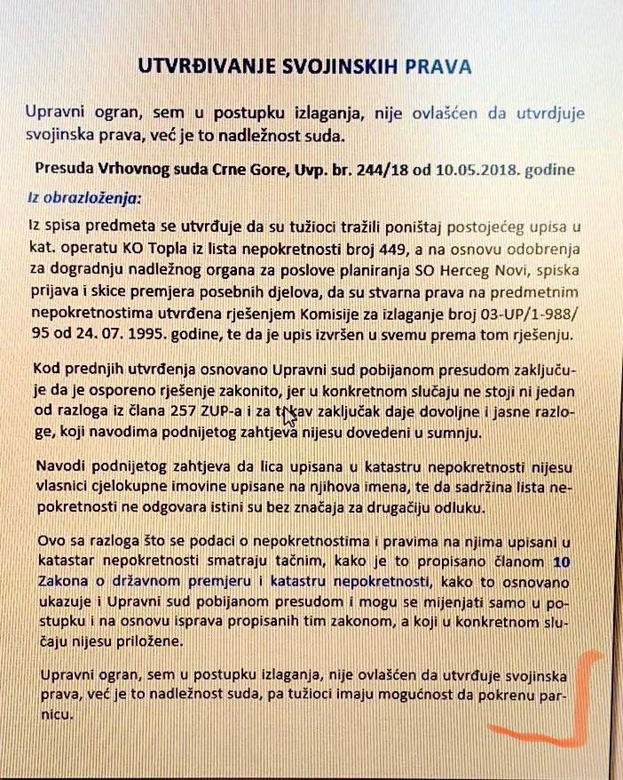 U kontekstu aktuelnog stanja u polemikama oko pravne umešnosti “upravnog postupka” odnosno da se pred organima UNCG, tj. kolokvijalno, referenata nadležnih katastara, utvrđuje pravo svojine, postoji jasan pravni stav koji je zauzeo pre samo godinu i po Vrhovni sud Crne Gore kao najviša sudska državna instanca.