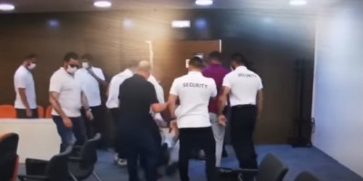 Na snimku se vidi da je do uptrebe biber spreja došlo u trenutku kada je privatno obezbeđenje iz sale izbacivalo odbornika Demokratskog fronta (DF) Đorđa Vujovića.