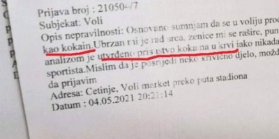 "Osnovano sumnjam da se u 'Voliju' prodaju banane koje, kada ih pojedem, deluju na mene kao kokain. Ubrzan mi je rad srca, zenice mi se šire, pun sam energije, neverovatno. Bio sam kod doktora i analizom je utvrđeno prisustvo kokaina u krvi, iako nikada tu supstancu nisam ni probao jer sam sportista. MIslim da je posredi neko krivično delo, možda šverc te droge, ili tako nešpto, pa bi ovim putem želeo da prijavim. Adresa: Cetinje, 'Voli market' preko puta stadiona."