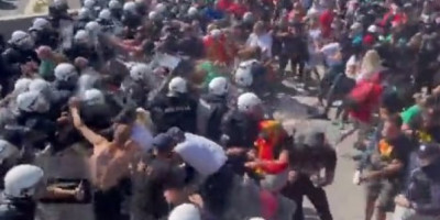 Na snimcima sa društvenih mreža vidi se kako rulja kreće na kordon, ka policajcima lete flaše i kamenice i oni se ubrzo povlače u stranu.