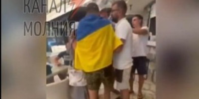 Na snimku se vidi ruski turista kako napada ukrajinsku porodicu koja je sa zastavom Ukrajine došla u kafić. Menadžer restorana izgleda da je stao na njegovu stranu i izbacio ih.
