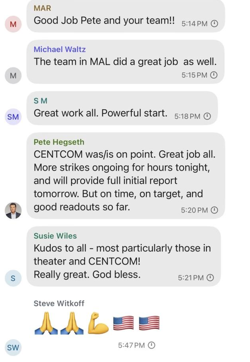 "Vreme sada (1144et): Vreme je povoljno. Upravo potvrđeno sa CENTCOM-om da pokrenemo misiju", napisao je Hegset, pre nego što je naveo vreme kada će F-18 napasti pola sata kasnije, a zatim započeti svoj udar još sat vremena posle toga.