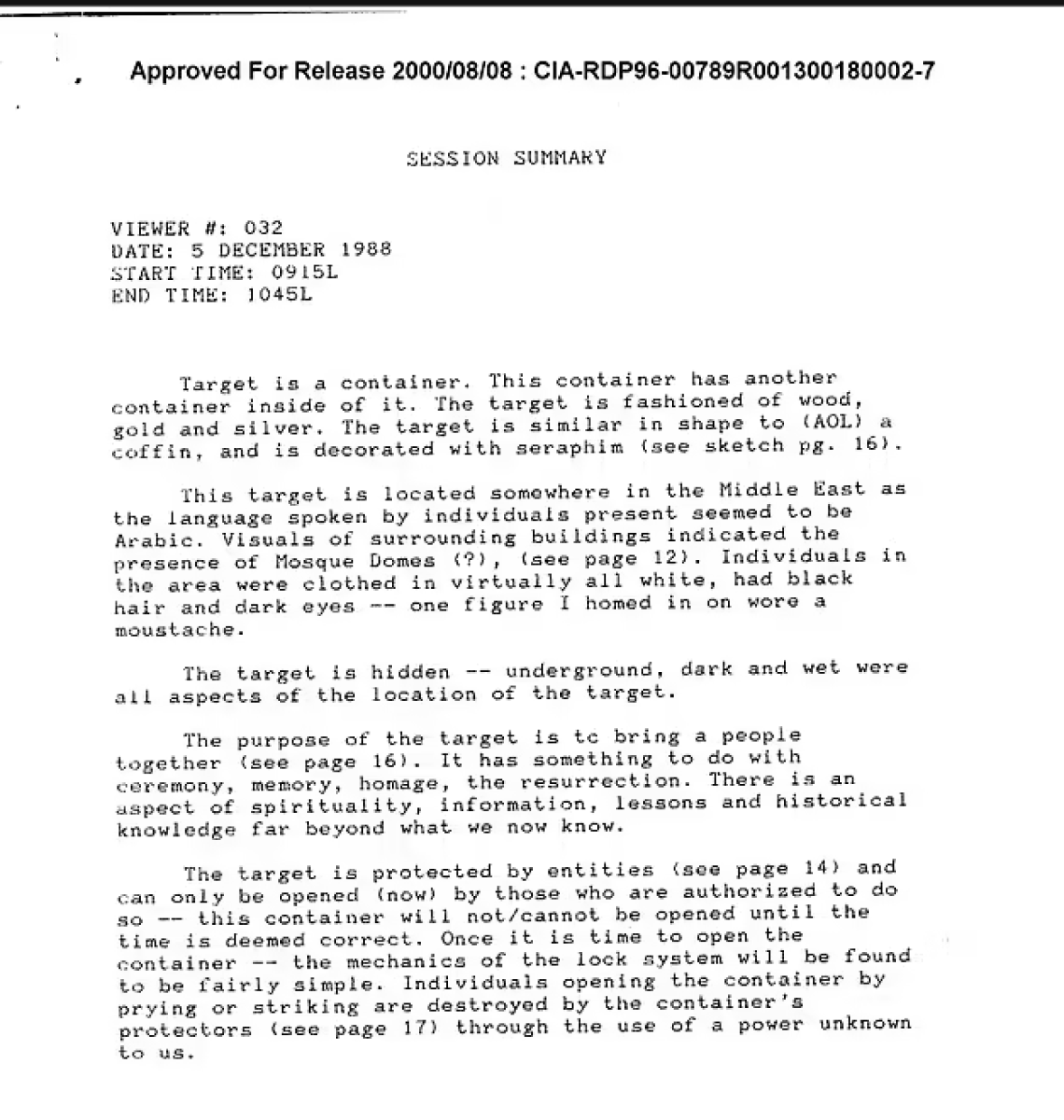 Dokument detaljno opisuje eksperiment iz decembra 1988. godine, kada je vidovnjak sa oznakom 032 učestvovao u testu daljinskog opažanja. On nije znao da je u pitanju Zavetni kovčeg – dobio je samo geografske koordinate.