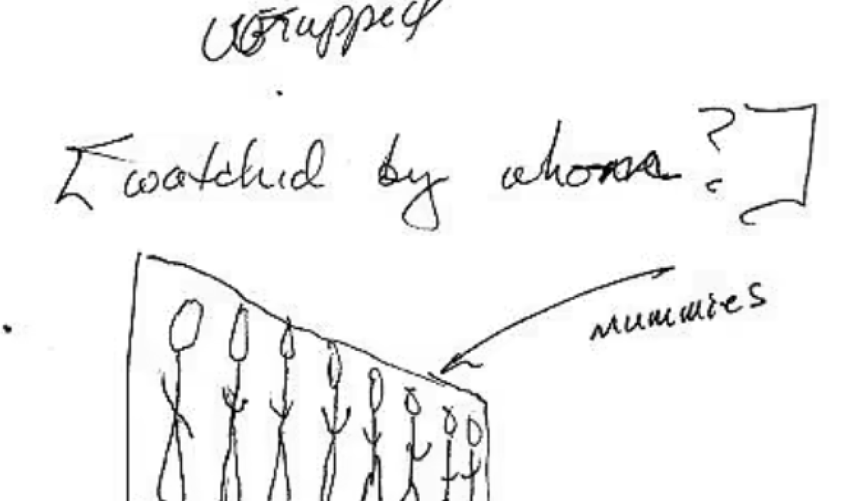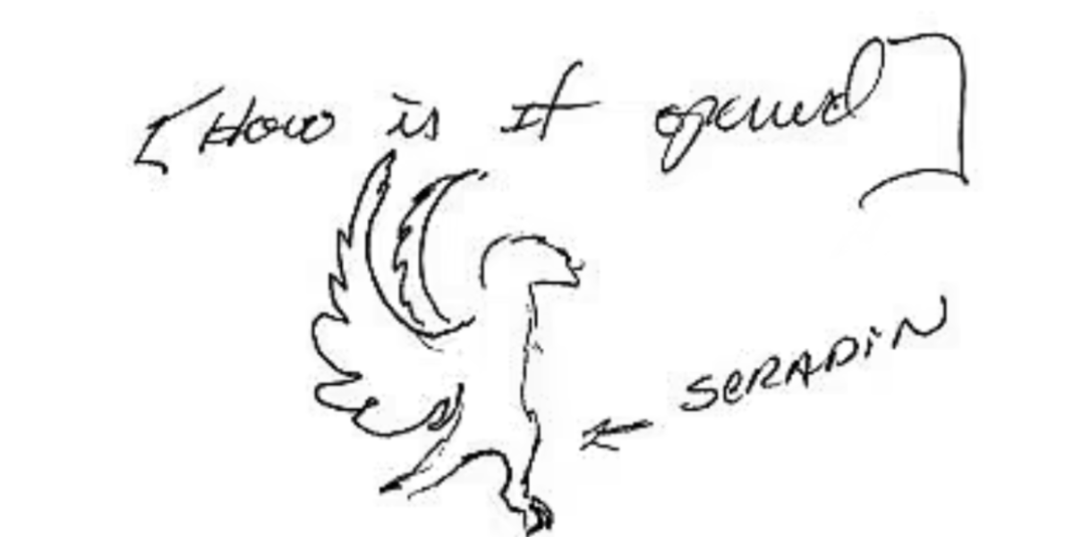 Dokument sadrži i brojne crteže i beleške koje je vidovnjak napravio tokom sesije: kupolaste zgrade slične džamijama, osam „mumija“ poređanih u liniju, krilato biće – serafim, kao i simbol točka.