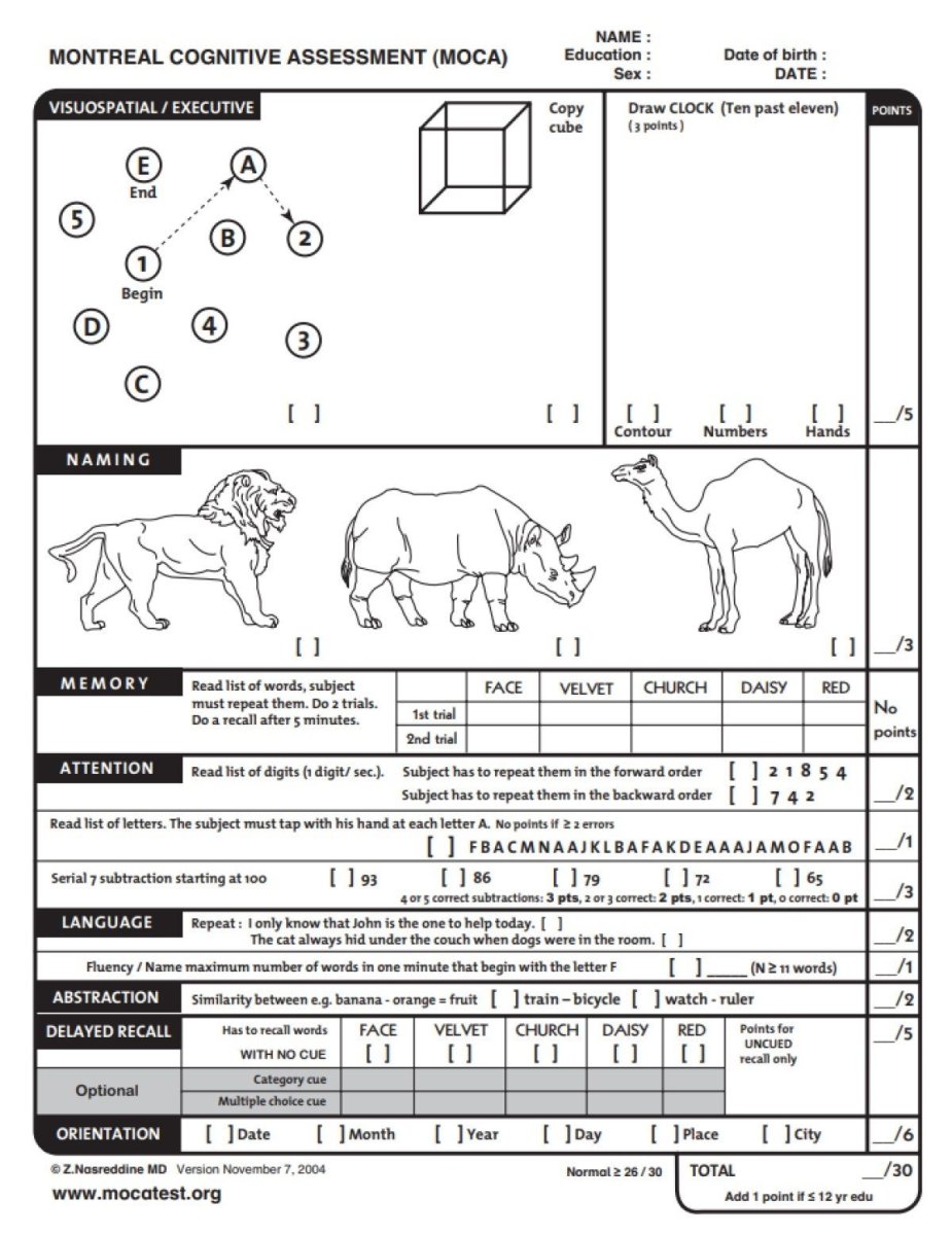 Test traje oko 10 minuta i obuhvata niz zadataka koji mere pamćenje, pažnju, govor, orijentaciju, apstraktno razmišljanje i mentalnu fleksibilnost. Maksimalan broj poena je 30 — sve ispod 26 smatra se razlogom za dalje neurološke provere.