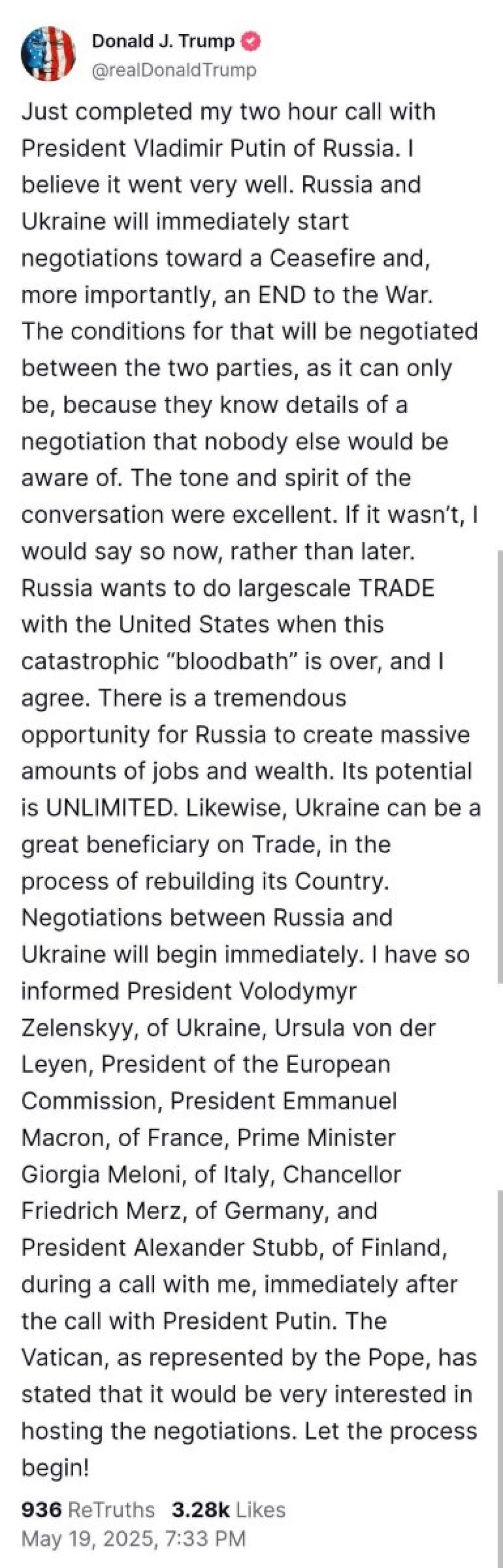 Upravo sam završio dvočasovni razgovor sa ruskim predsednikom Vladimirom Putinom. Verujem da je prošlo veoma dobro. Rusija i Ukrajina će odmah početi pregovore o prekidu vatre, a što je još važnije - o kraju rata, poručio je lider SAD.