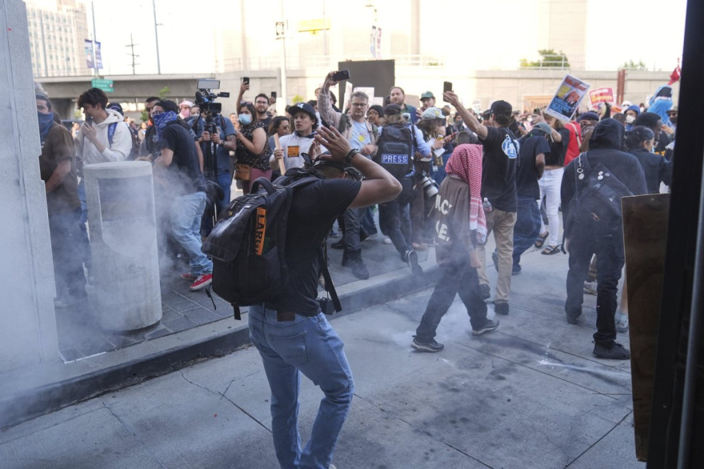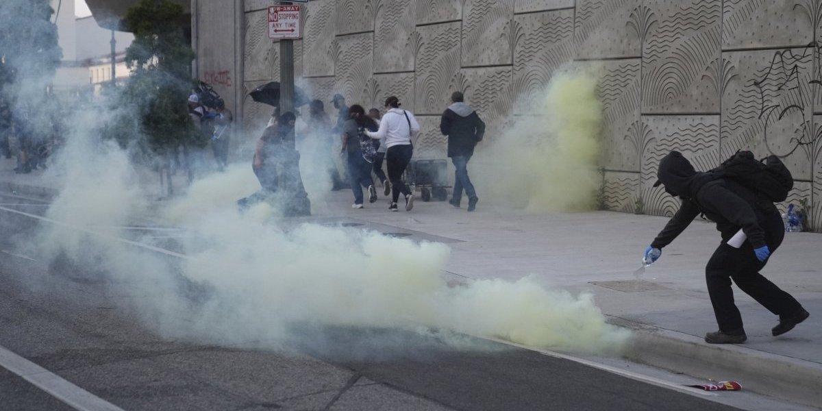 Sukobi između policijskih snaga za suzbijanje demonstracija i aktivista koji protestuju protiv imigracijskih racija izbili su u sinoć u centru Los Anđelesa, nakon serije federalnih racija tokom dana, u kojima je, prema izveštajima, privedeno nekoliko desetina osoba širom grada.