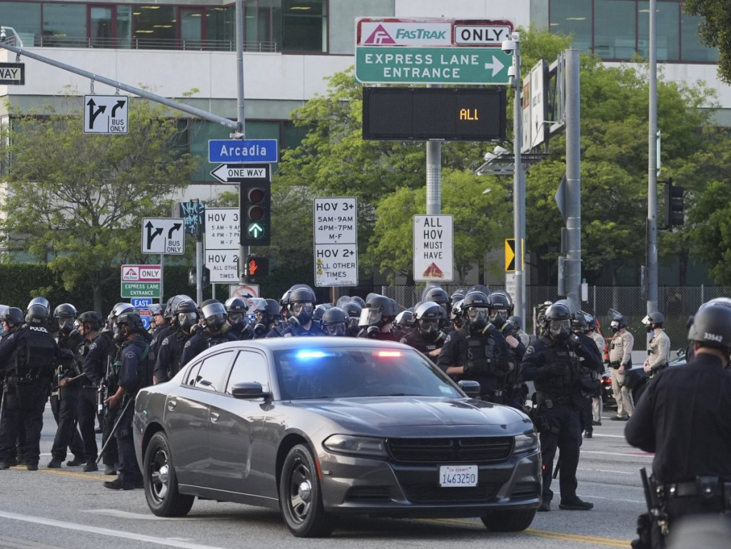 Rojtersov snimak uživo prikazuje policajce iz Policijske uprave Los Anđelesa, opremljene šlemovima i zaštitnim opremama, koji su se suočili sa demonstrantima u centru grada.