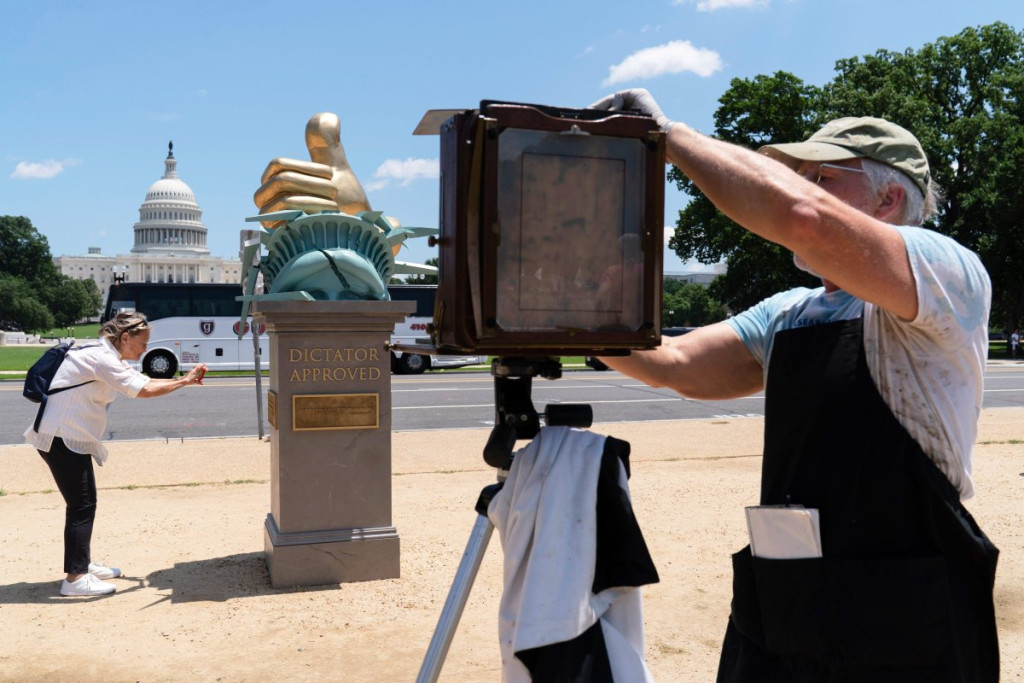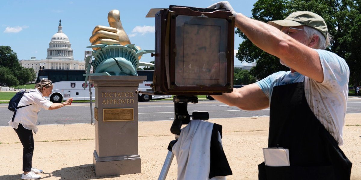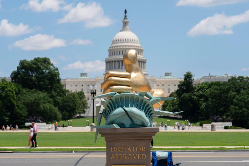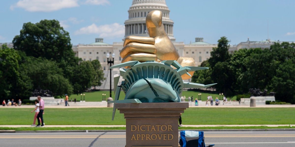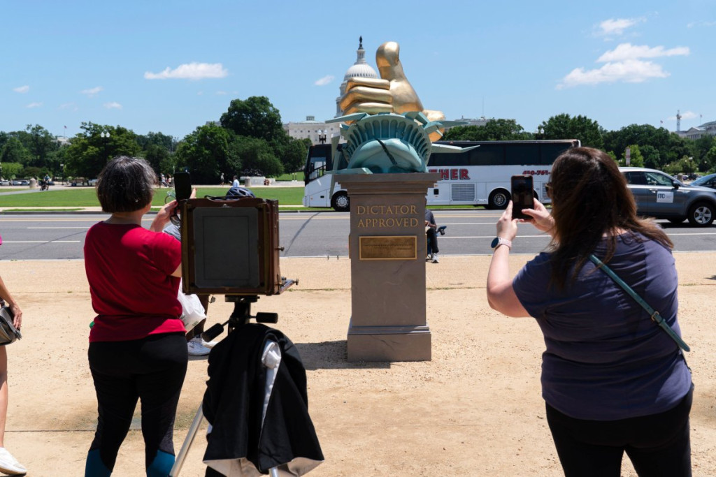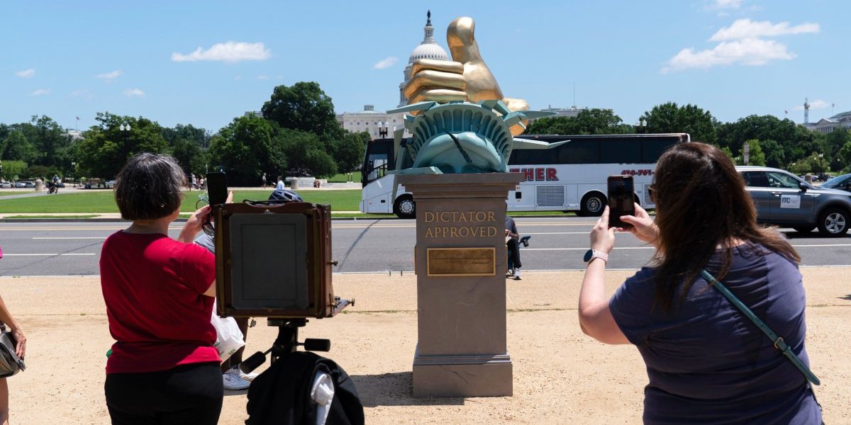 Pozlaćena skulptura koja prikazuje ''palac gore'' kako razbija Kip slobode, pod nazivom ''Diktator odobrava'', postavljena je ispred Kapitola u Vašingtonu i poredi predsednika SAD Donalda Trampa sa liderima poput Kim Džong Una i Vladimira Putina.
